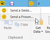 I want to use this tool to clean up my Power Query code in my Power BI model, so the first thing I’ll do is open my Power BI model in Power BI Desktop. Next, we need to capture my Power Query queries so to do this I’ll click the smiley face icon at the very top of Power BI Desktop and click Send Frown.