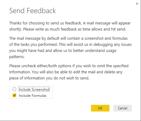 A little Send Feedback dialogue box will pop up. Uncheck the Include Screenshot (since we really don’t care about that) and leave the Include Formulas box checked. This will allow us to see the Power Query queries. Click OK.