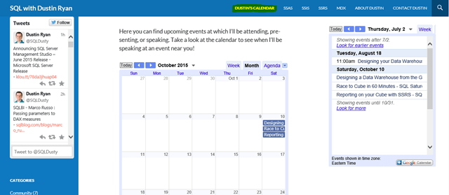 You may have also noticed that I’ve added my speaking calendar to my blog. At the top of my blog you’ll find a link to Dustin’s Calendar, as well as a smaller version of the calendar in my blog’s right sidebar. The purpose of the calendar is to make my speaking schedule more available to you. I love to have interaction with the audience and readers of my blog when I’m out speaking at SQL Saturday and other PASS events so hopefully I’ll be able to increase my availability and interaction with you through the calendar.