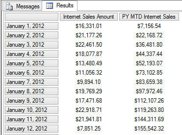 with member [Measures].[PY MTD Internet Sales] as Aggregate( MTD( ParallelPeriod( [Date].[Calendar].[Calendar Year], 1, [Date].[Calendar].currentmember ) ), [Measures].[Internet Sales Amount] ) Select { [Measures].[Internet Sales Amount], [Measures].[PY MTD Internet Sales] } on 0, Non Empty [Date].[Calendar].[Date].members on 1 From [Adventure Works] Where [Date].[Calendar Year].&[2012]