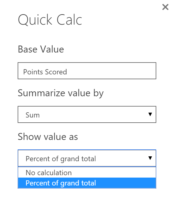 Now we can quickly choose to show a value as a calculation of the percent of grand total.