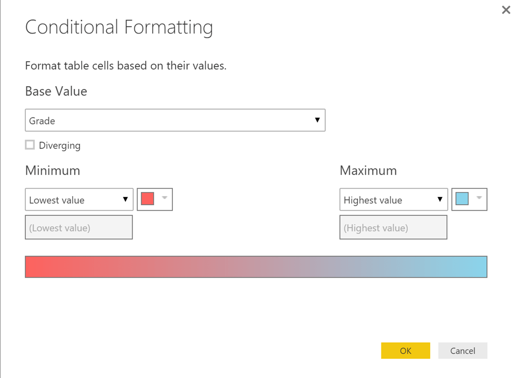 In the Conditional Formatting options, the formatting is based on the Base Value, which at this time appears to be limited to the field you’re applying the conditional formatting. The formatting can be based on the highest and lowest values in the column or on absolute values that you specify.