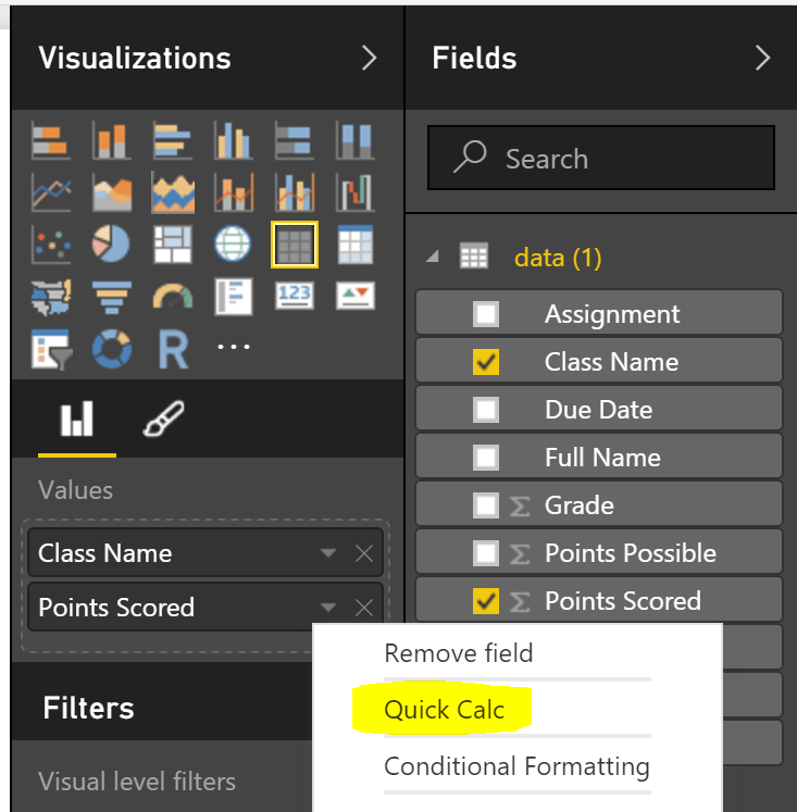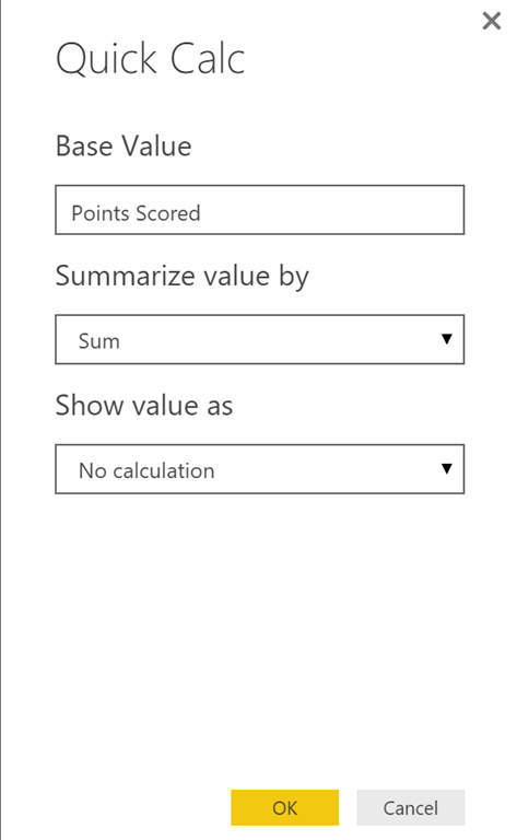 Quick Calc is a new feature that easily allows us to create calculations by numeric measures in our data without having to write DAX. To see the new Quick Calc feature, select the drop down arrow next to the numeric field you want to use.