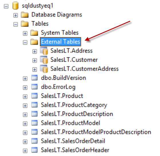 6. I have SQL Server Management Studio and my Azure server opened. Yet I cannot see any “External Tables” nor the folder when I expand the databases. Any ideas?