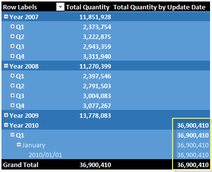 So when we slice the Total Quantity by Update Date calculation by the Date table, the relationship used is the not the default Active relationship as is the case with the Total Quantity measure. We can clearly see this illustrated below in the pivot table: