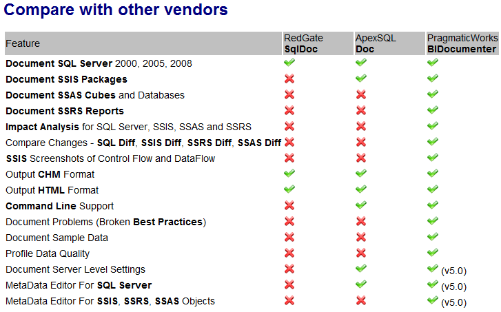 BI Documenter is a pretty cool documentation tool that is very well rounded and since it’s the only tool on the market that can document the entire BI stack all together, its basically you’re only choice if you want to do impact analysis across the stack. BI Documenter also has a lot of awesome features coming up in the next release such as documenting server level objects, like SQL Agent Jobs, Linked Servers, Backup Locations, and others.