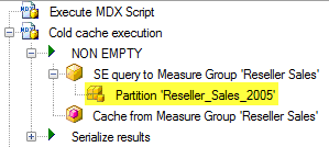 As you can see, Q1 and Q2 are excluded from the results because the cells are empty. The NON EMPTY keyword essentially says, “After we decide which members go where and which cells are going to be returned, get rid of the empty cells.” If we take a look at the execution tree using MDX Studio, we can see the 2005 partition is the only partition being hit because NON EMPTY is being applied at the top level as the very last step in the query execution. The 0 axis is taken into account before evaluating which cells are empty.