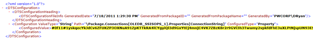 Yay! Now your package has an XML configuration file set up to dynamically configure your connection string of the connection manager you selected at run time. All that is left to do is to copy the XML configuration file to each environment the package will be run on: developer machines, development, QA, and production environments. Then you must also update the XML configuration file with the environment’s connection string. Just open the XML file in note pad and update the Connection String to point to the appropriate server and database.