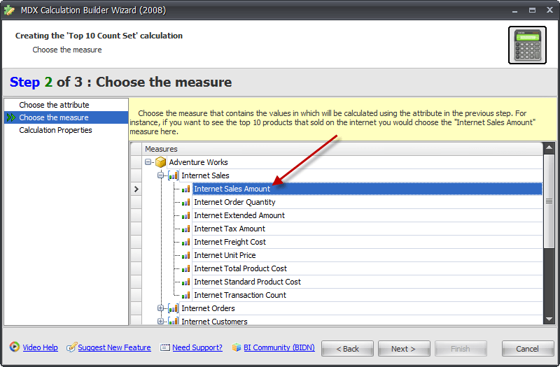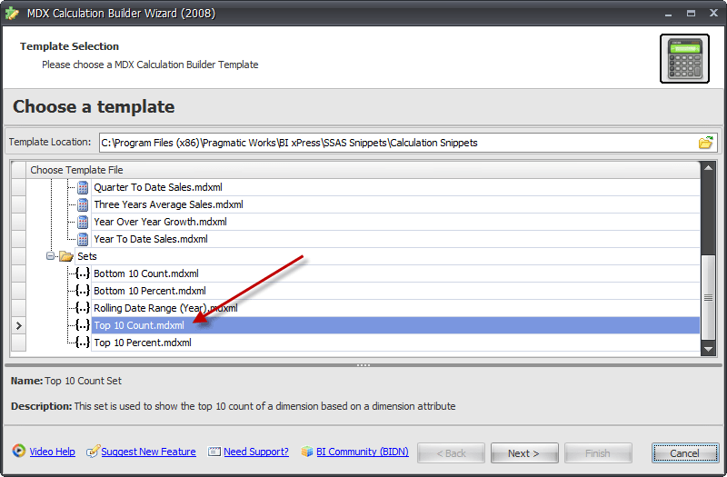 This will open the MDX Calculation Builder Wizard. Select the Set template you’d like to use. I’m selecting the Top 10 Count template.