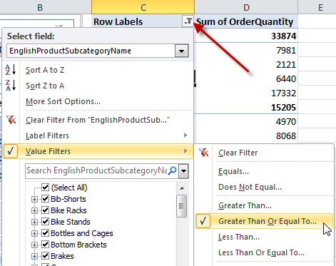 To filter records where a measure is greater than or less than a certain amount is pretty easy. In your workbook, just click the drop down arrow above the attribute you wish to filter, go to Value Filters, and select Greater Than, Less Than, or whichever option you desire.