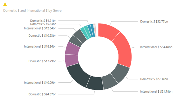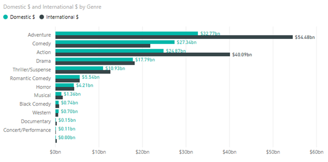Let’s look at two different charts that I think will illustrate my point on the importance of choosing the right visualization for the story. The chart below shows a comparison of Domestic Sales and International Sales for different movie genres. If the purpose of this chart is to determine from which market most of the money comes from for the various film genres, then this chart isn’t doing that great of a job because we can’t clearly see the difference between the markets for Westerns.